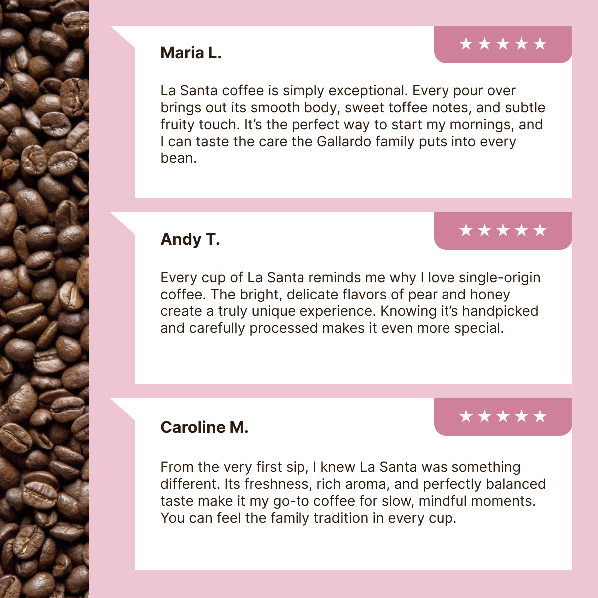 We love this coffee as a pour over or drip. Light, bright and delicious, La Santa is quickly becoming one of our favorite single origin coffees.