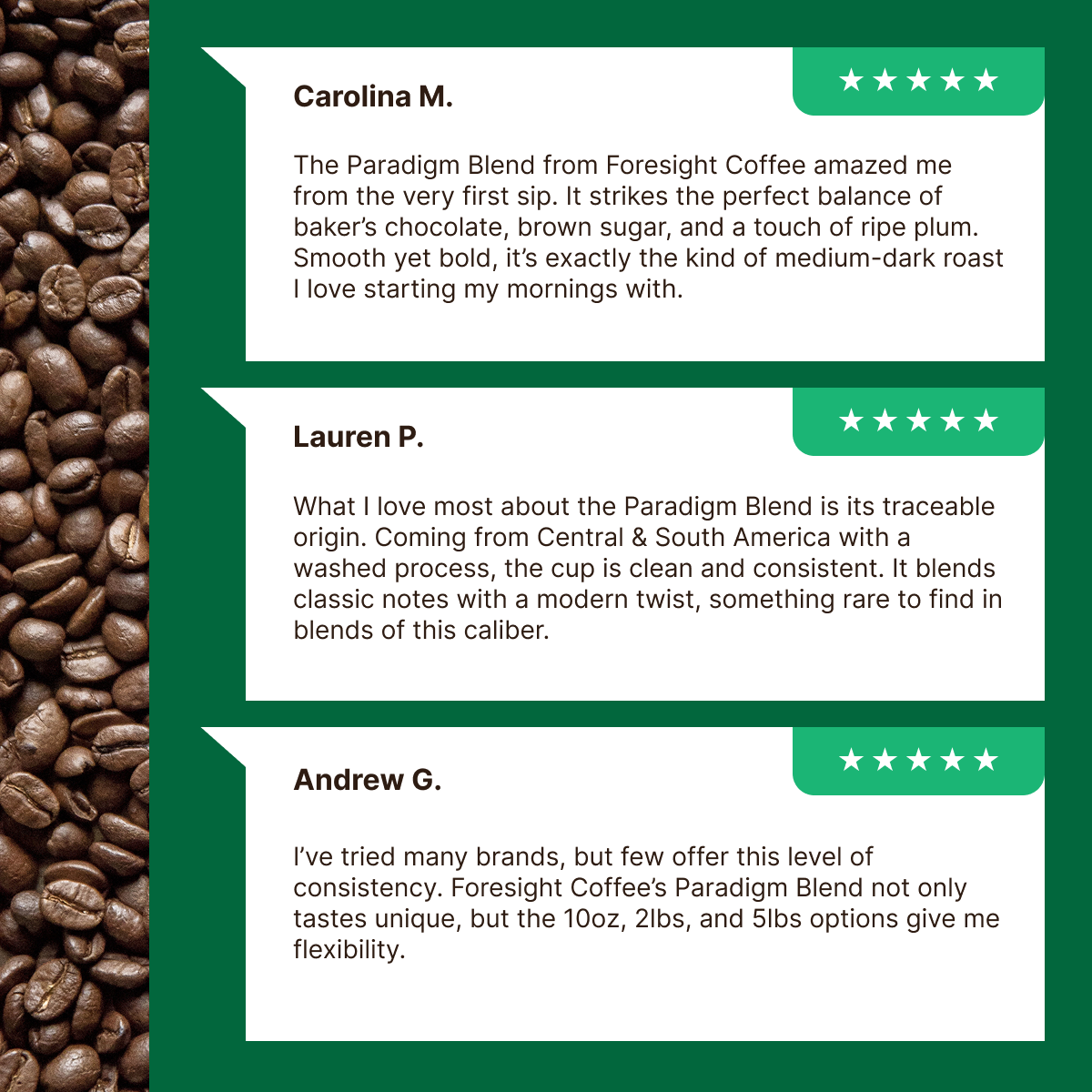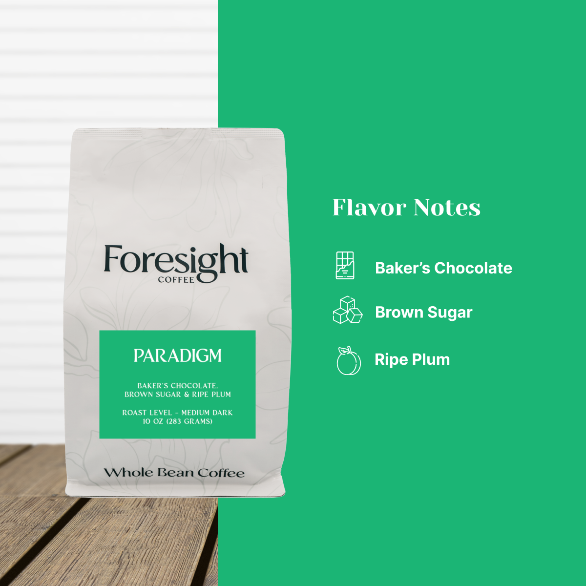 Paradigm is a blend of medium-dark roasted coffees from Central America and South America, boasting warm notes of baker's chocolate, brown sugar and ripe plum.  Full-bodied and rich, with mild acidity, Paradigm has all of the cozy characteristics you are looking for in an espresso or morning cup.